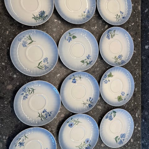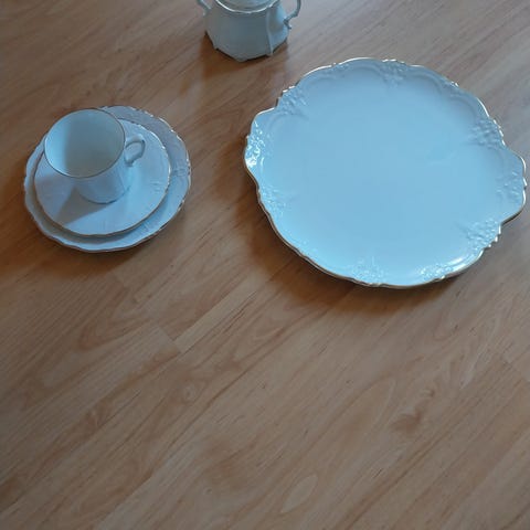 Kaffeservis, 9 hela koppar med fat o assiett. Tre extra med lite stött på kanten men man kan få dem med om man vill. Sockerskål o en liten mjölkkanna med litet märke på kanten.