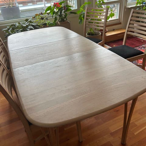 Robust matbord med dubbla iläggsskivor som är integrerade i bordet. 90x90 cm, alt 165x90 cm. Höjd 75 cm