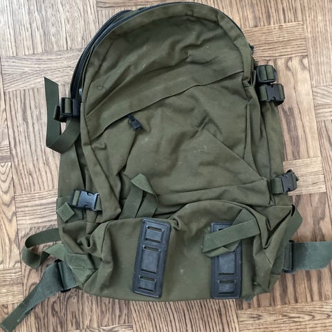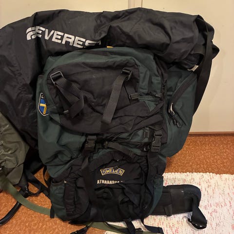 ryggsäck i grön färg. Ryggsäcken har flera ytterfickor och remmar för kompression och fastsättning av utrustning. Passar för vandring, friluftsliv och resor där extra packvolym och fackindelning behövs