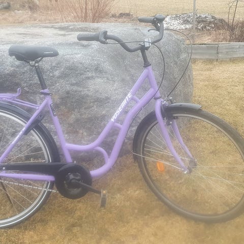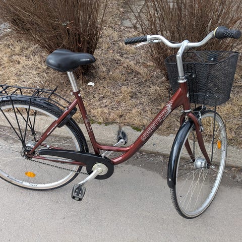 Korg framtill, pakethållare, fot- och handbroms, 3-växlad, ramlås, stöd, ringklocka.