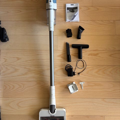 Electrolux dammsugare i vit färg med teleskoprör och golvmunstycke. Modellen är en traditionell dammsugare med slang, hjul och bärhandtag. Passar för dammsugning av hårda golv och mattor i hemmet. På bilden syns standardmunstycke för golv samt anslutning för dammsugarpåse inuti enheten.