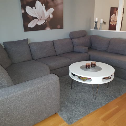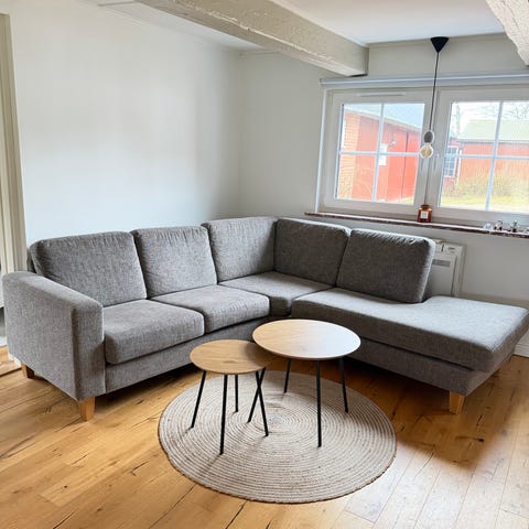 Grå hörnsoffa med divan från Möbelhuset Leander-Pehrson i Ystad ca 10 år gammal.