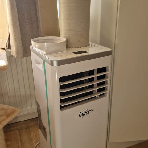 Portabel luftkonditionering i vit färg av märket Polario. Enheten har utblås framtill, digital display och enkla knappar för styrning på ovansidan. Den är försedd med slang för varmluft samt integrerade bärhandtag på sidorna. Hjul gör att den kan rullas smidigt. Luftkonditioneringen står på hjul för enkel förflyttning mellan olika rum och ansluts med vanlig elkabel till vägguttag.