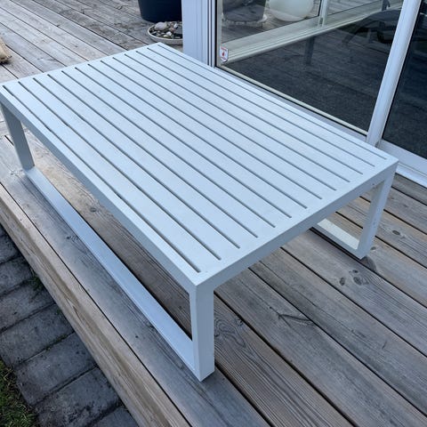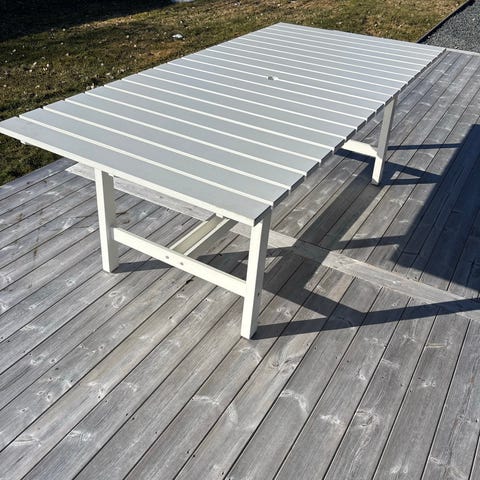 Ett trädgårdsbord i "Aintwood" från Rusta med plats för 4 personer. Behövs skrubbas av.