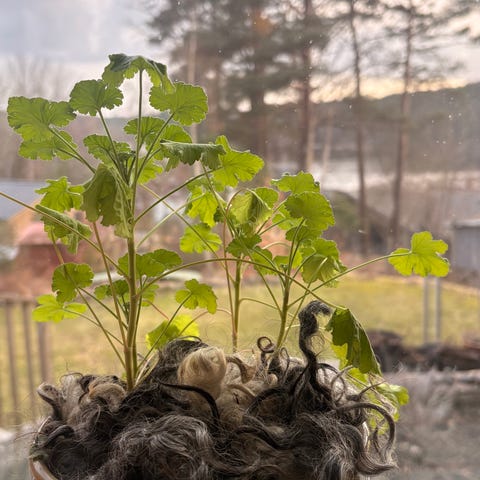 Våreld liten 20 kr, i mitten 30 kr, i kopp med pelargon för 50 kr.