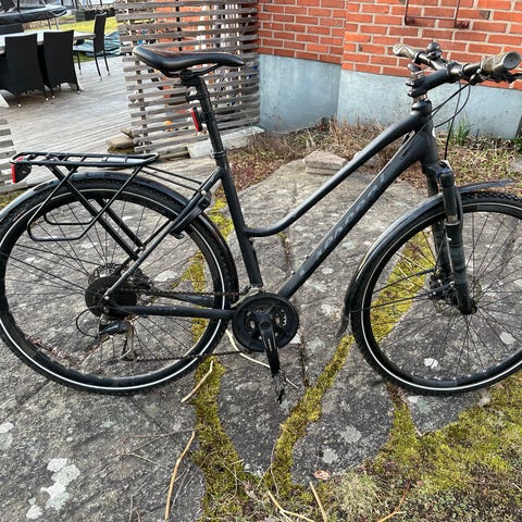 TREK hybridcykel för dam/unisex med ramstorlek M och 28"/700c-hjul. Cykeln har rak aluminiumram med framgaffel anpassad för hybridbruk. Utrustad med skärmar, pakethållare, stöd, reflexer och ljus. Rakt styre med ergonomiska handtag och sadel anpassad för vardagscykling. Passar för pendling och fritidscykling på väg och grusunderlag. Dämpning finnes. Växlar shimano Alivio och Acera. 18 växlar. Skivbromsar. Bakbromsen behöver fixas lite.