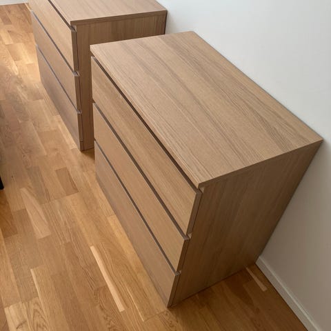 Säljer 2st IKEA Malm sängbord i ekfanér. Mycket bra skick. 40x55x48cm.