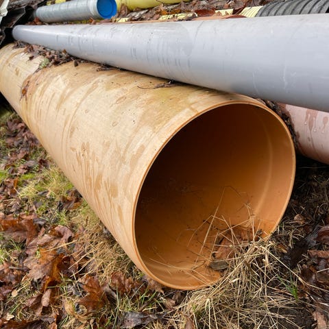 Bruna avloppsrör i plast. Rören är raka och försedda med muff i ändarna för sammankoppling. Lämpliga för avlopps- eller dräneringsinstallationer utomhus eller i mark, beroende på dimension och lokala installationskrav. Säljs som byggmaterial för VVS- och markarbeten.