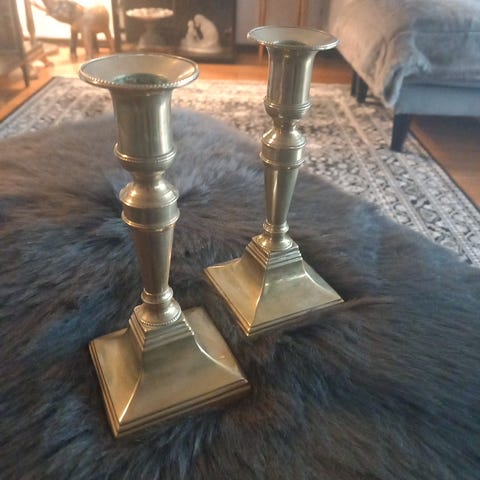 Två identiska golvljusstakar som är rejäla och tunga. Stämpel anger Ljuders i Hovmantorp 1955.