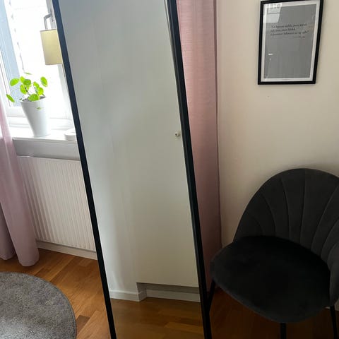 IKEA spegel i modell Lindbyn. Tunn svart metallram runt om. 40x130cm. Spegeln är fristående och kan lutas mot vägg. Passar i sovrum, hall eller vardagsrum för helkroppsspegling och som inredningsdetalj.