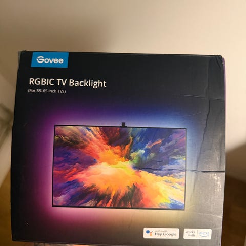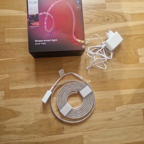 Philips Hue Play Gradient lightstrip för TV, anpassad för 65-tums TV. LED-ljusslinga med flerfärgat ljus avsedd att monteras på baksidan av TV:n för bakgrundsbelysning. Kompatibel med Philips Hue-system för styrning via app och röstassistenter. Levereras i originalförpackning med ljusslinga och tillhörande kablar enligt bilder.