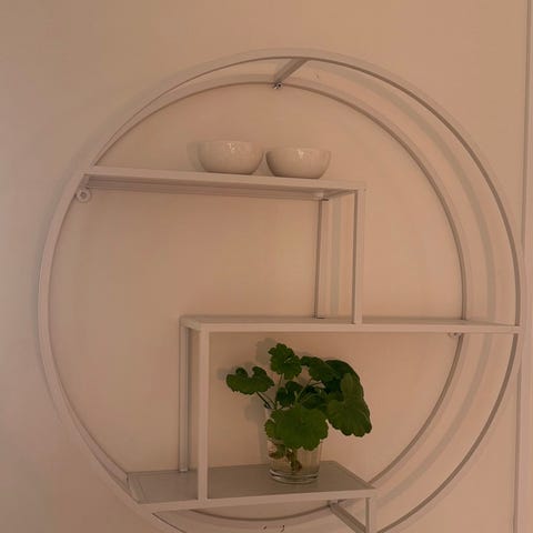 Gatsby - vägghylla i vit lackerad metall 60 cm i diameter, djup 13 cm. Snygg inredningdetalj, väldigt användbar och lättplacerad. Nypris 599 kr