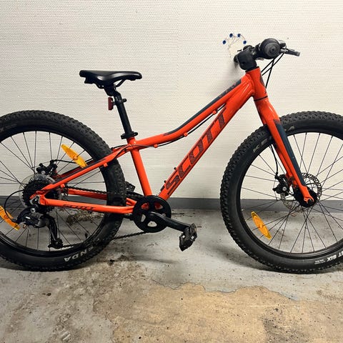 8-växlad Scott Scale barncykel med 24" hjul i svart med orange detaljer. Utrustad med skärmar fram och bak, grovmönstrade däck och handbromsar. Passar barn som behöver en något större cykel för vardagscykling och enklare turer på varierat underlag. Väldigt lite använd.