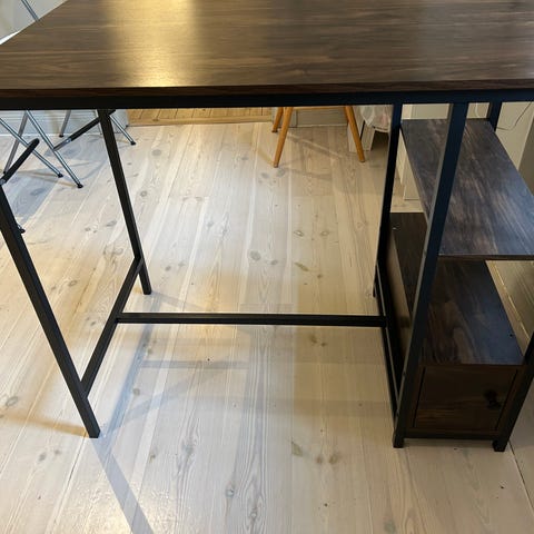 Fint skrivbord, sparsamt använt. 150cm långt åt båda hållen, 50cm djup, 76 cm högt.
