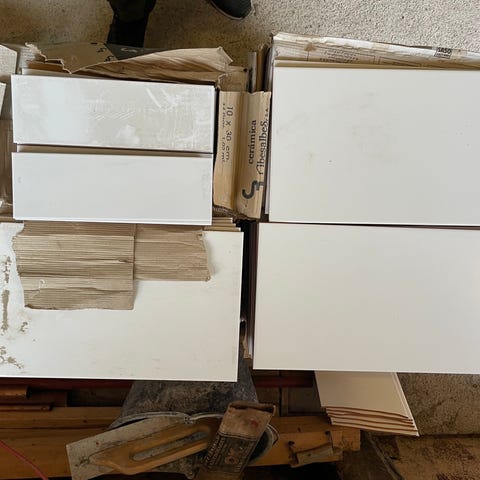 Kakelplattor i format 10x10 cm. Blåa lådan har ljusgråa plattor och den genomskinliga lådan har vita plattor. Plattorna är avsedda för vägg för till exempel kök, badrum eller andra utrymmen där kakel önskas. Antalet plattor framgår av respektive låda enligt text på lådorna.