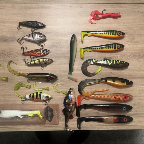 BFT Berkley blandat fiskeset med flera drag, spön, rullar och tillbehör. Setet innehåller olika typer av beten i flera färger och storlekar, både hårda och mjuka. Flera fiskerullar syns på bilderna, tillsammans med håv, tänger och mindre tillbehör som tafsar och förvaringaskar. En större fiskelåda/väska från Berkley och en mindre väska från BFT ingår, liksom en beteshink. På bilderna finns även ett båtkapell i kartong och vissa övriga tillbehör för fiske och båtliv. Exakt antal delar framgår av bilderna. Köp allt för 2500kr