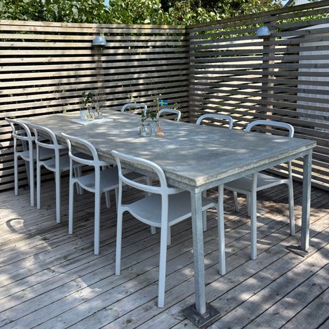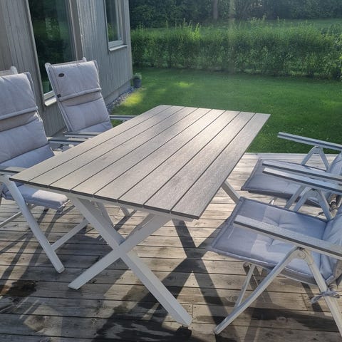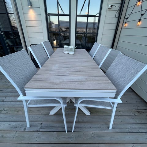 Matgrupp utomhus runt bord med stolar vit grå trädetaljer