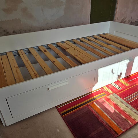 Utdragbar säng med 2 lådor till förvaring. Det finns vissa märken på sängramen ( se bilder). Madrasser ingår inte.