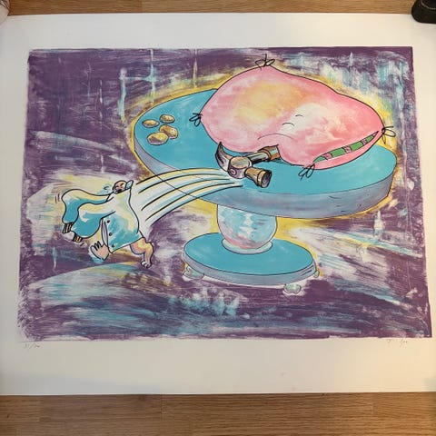 Litografi av svenska konstnären Fruls Tilpo, numrerad 60/70 och signerad. Mått 62 x 78 cm. Får gärna hämtas på plats, och se gärna min andra annons med ett till verk av Tilpo.