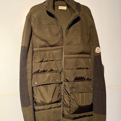 Moncler jacka för herr i storlek M. Jackan är svart och tillverkad i bomullsmaterial med vadderad front och stickade ärmar och rygg. Modellen har hel dragkedja framtill och Moncler-logotyp på ärmen. Passar som lätt ytterjacka eller mellanlager i svalare väder.