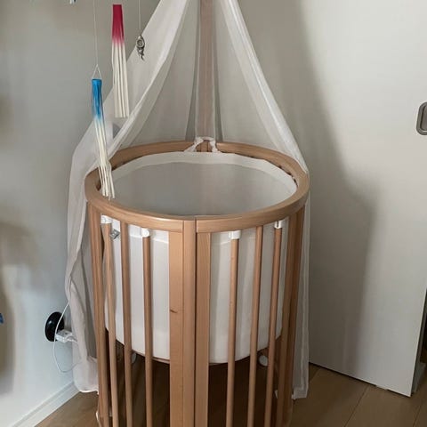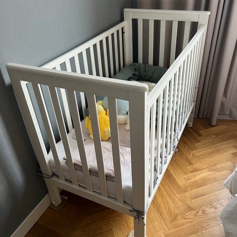 Ferm spjälsäng i ljus färgsättning med rundade hörn och ribbor runtom. Sängen är avsedd för spädbarn och mindre barn och kan användas som sovplats i barnrum eller bredvid föräldrarnas säng. Konstruktionen ger god insyn och luftcirkulation runt barnet. Passar standard madrass för spjälsäng. Textilier, kuddar och leksaker på bilderna kan ses som exempel på hur sängen kan användas men ingår inte nödvändigtvis. Storlekar BxDxH 146x76x 85