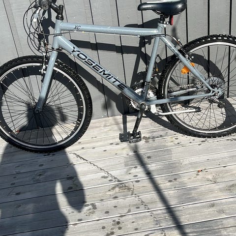 Yosemite barncykel med 26" hjul i grå färg från Biltema. Cykeln har fram- och bakskärm samt reflexer. Endast handbroms. Passar äldre barn som behöver en cykel för vardagsbruk och fritidscykling. Bra skick men har märken. Handtagen slitna och något rostmärke finns.