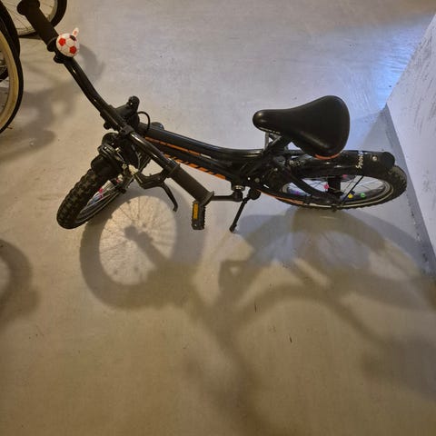 Barncykel med 16" hjul i röd färg. Utrustad med pakethållare bak, skärmar fram och bak, kedjeskydd samt fot- och handbroms.