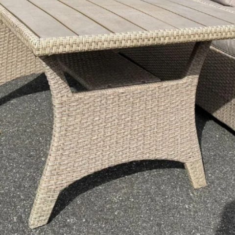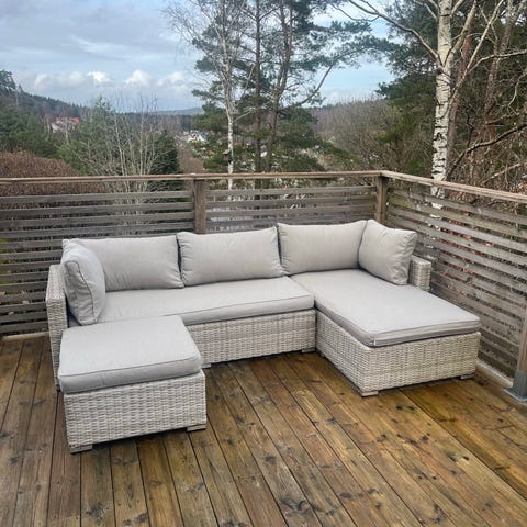 Hörngrupp för utebruk med tillhörande bord. Soffdelen är utformad som en hörnsoffa med rygg- och sittdynor i grått tyg. Passar för uteplats, altan eller trädgård som sittgrupp för flera personer.