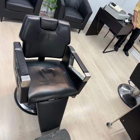 Armstöd och detaljer är i metall. Stolen är avsedd för användning i frisör- eller barberarsalong och är utformad för att ge stabil sittställning vid klippning och rakning.