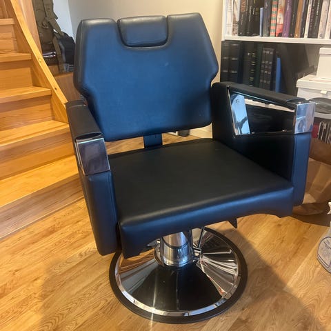 Frisörstol i svart utförande med klädsel i konstläderliknande material. Stolen har höj- och sänkbar hydraulisk fot, justerbart ryggstöd och separat fotstöd.