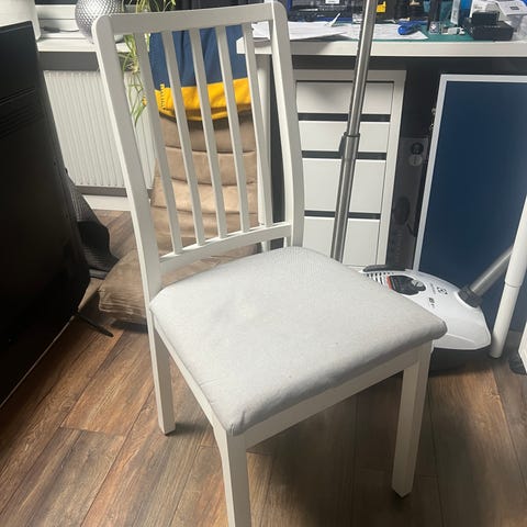 Matstolar i trä med vitmålad stomme och grå stoppad sits i tyg. Stolarna har hög rygg med lodräta ribbor och rak benställning. Passar som sittplatser vid matbord i kök eller vardagsrum. Ena dynan lös märken på stolarna där av detta pris 200 kr för båda stolarna