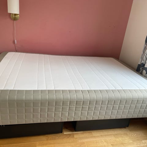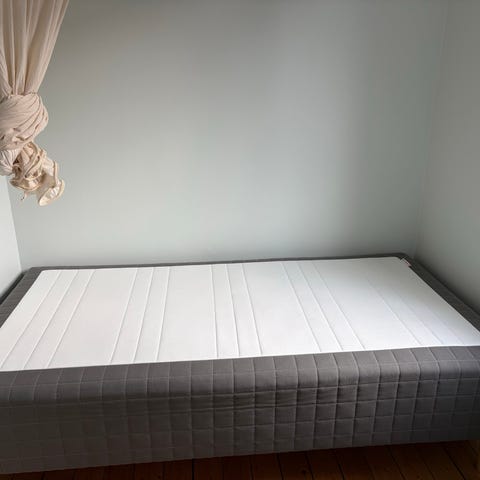 Enkelsäng 90 cm säljes med en tryckavlastande bäddmadrass. Sängen står i ett gästrum och är mycket sparsamt använd.