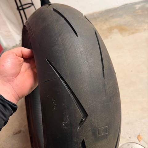 Framdäck SC1 120/70 R17, ett par bandagar. Skjutmåttet i TWI visar 3,5mm kvar på mest slitna stället (sidan)
