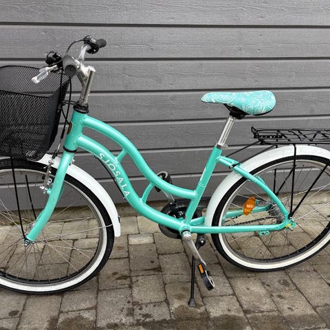 Sjösala barncykel med 24" hjul i härlig turkos. Cykeln har lågt insteg, pakethållare bak, korg fram, stänkskärmar och kedjeskydd. Utrustad med fotbroms bak och handbroms fram. Utrustad med 3-växlad med vridreglage i handtaget. Sadel och handtag är anpassade för barn för en mer upprätt och bekväm sittställning.