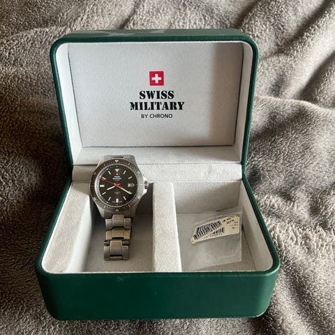 Swiss Military herrklocka med automatisk urverk och svart urtavla. Klockan har roterande bezel med minutmarkeringar och datumvisning vid kl. 3. Boetten är i metall med borstad finish. Urtavlan har tydliga index och visare med ljusmarkeringar. Till klockan följer flera utbytbara band i olika färger och material. Levereras med originalask och dokument som visas på bilderna.