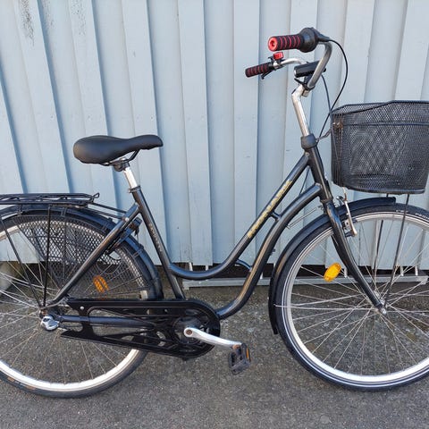 Fotbroms bak, handbroms fram, pakethållare, fotstöd, cykelkorg .