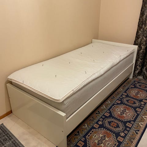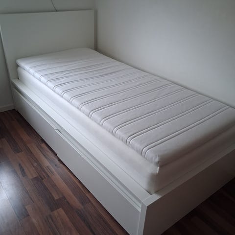 Brimnes 2x80 cm utdragbar säng i bra skick. Inkluderar två Malfors madrasser. Djur- och rökfritt hem. Har använt madrasskydd.
