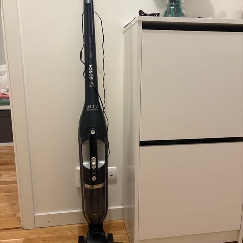Bosch sladdlös skaftdammsugare i svart utförande. Dammsugaren är fristående på laddstation/sockel och är avsedd för rengöring av golv i hemmet. Modellen har handtag med integrerade reglage och dammbehållare placerad i skaftet. Passar för daglig städning av hårda golv och mattor i hushållsmiljö.