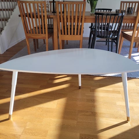 Ett äldre soffbord i teak. Har täcken på användning på bordsskivan vilket syns på bilderna. Annars bra skick.