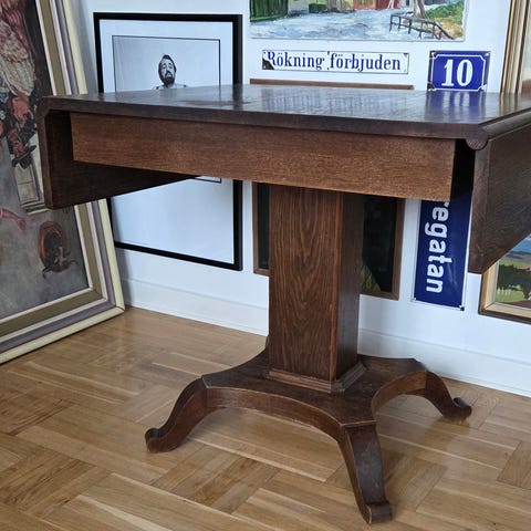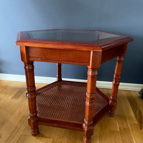 Fällbart sidobord i trä med kvadratisk glasskiva. Bordet har rödbrun trästomme med kryssben som ger stabilitet. Bordsskivan är försedd med glas ovanpå en dekorativ yta. Bordet kan fällas ihop för enklare förvaring och är lämpligt som soffbord, avlastningsbord eller litet matbord i vardagsrum eller annan del av hemmet.