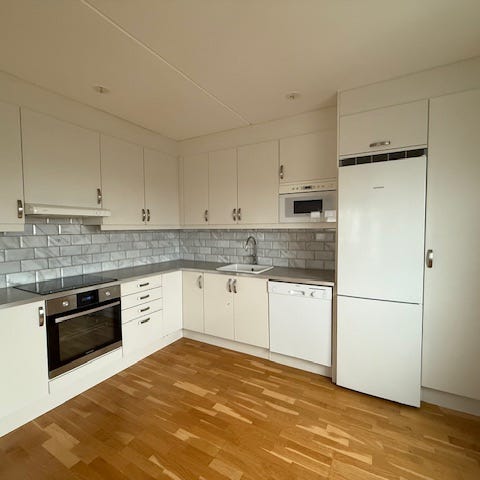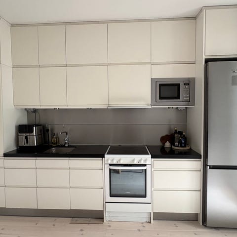 Köket är utrustat med inbyggd ugn, spishäll, fläkt, diskho med blandare, inbyggd mikro samt integrerad kyl och frys. Infälld belysning under överskåpen. Passar som komplett köksinredning i lägenhet eller mindre kök.