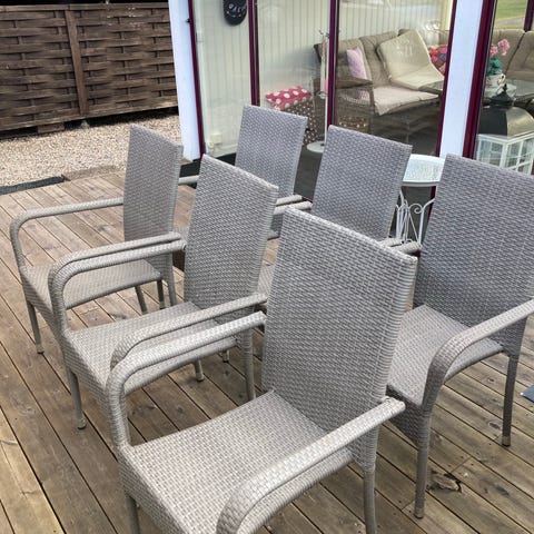Trädgårdsstolar med hög rygg i grå konstrotting. Stolarna har armstöd och smala ben med metallskydd längst ned. Flätad konstrotting runt hela stolen, inklusive ben och ryggstöd.