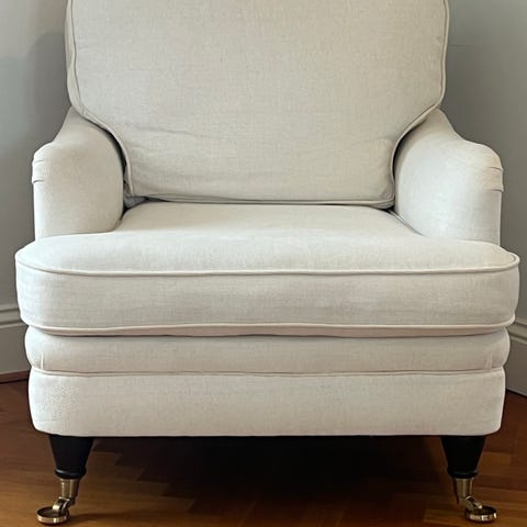 Grå/beige fåtölj med fotpall, i fint skick!