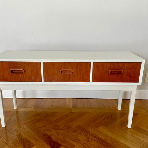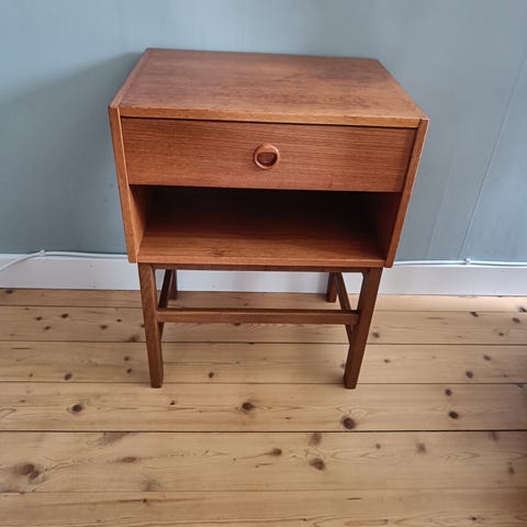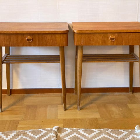 Nätta vägghängda sängbord i teak säljes pga flytt. Ett av borden har en fläck som bör gå att fixa ganska lätt. Borden har även små repor, som också de bör gå att fixa.. I övrigt är de i gott skick.