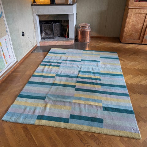 IKEA matta i ull med randigt mönster i flera färger, bland annat gröna, grå, blå, beige och gula toner. Rektangulär form som passar exempelvis vardagsrum eller sovrum. Mattan är avsedd för inomhusbruk och kan placeras under soffgrupp eller matbord för att skapa en mjuk yta på golvet.