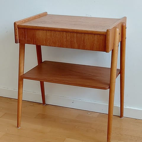 Stilrent sängbord / nattduksbord i teak med tidstypisk design från 1960-talet. Möbeln har en praktisk låda samt en öppen hylla för extra förvaring. Nyoljad, fint bruksskick med vacker patina.