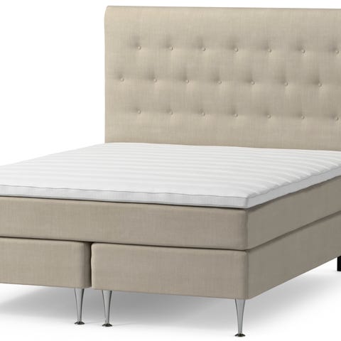 Kontinentalsäng i grått tyg med mått ca 160x200 cm. Sängen består av två nedre resårbottnar och en övre madrassdel samt en hög, vadderad sänggavel med knappar. Smala metallben ger sängen en något högre ligghöjd och ett luftigt uttryck. Passar som dubbelsäng i sovrum.