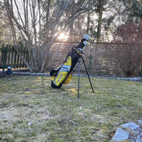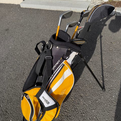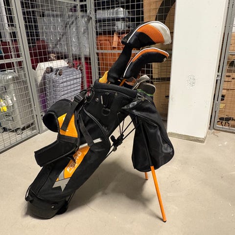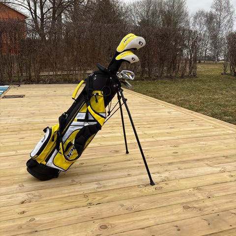 Bagen går både att bära och ha på vagn. I paketet ingår: bag, putter, hybridklubba och järnklubbor 7, 9 & SW. Längden på järn 7:an i det gula paketet (12-14 år) är ca 86 cm passar juniorer mellan 150-170 cm. Skaft: Open junior grafitskaft.