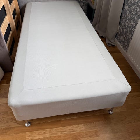 IKEA Skårer säng i storlek 90x200 cm. Resårsäng med beige klädsel och metallben.