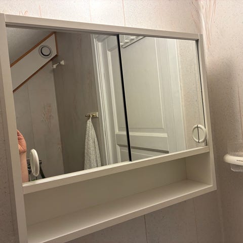 En stor badrum spegelskåp med två spegel skjutdörrar